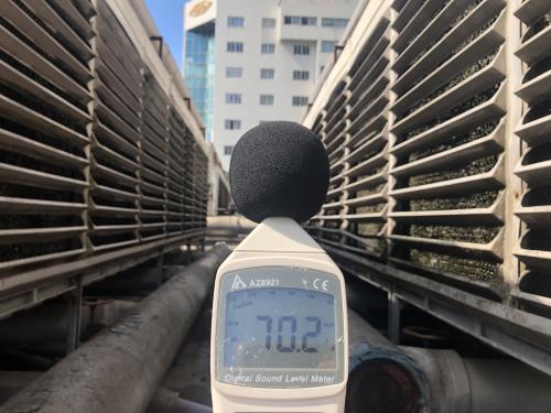 冷卻塔噪音現象:制冷機房內有噪音。某項目制冷機房面積350m2。安裝了 5 臺 8S-12.5 壓縮機。其中三臺運行正常。機房高度內平均噪聲為91dB(A)。機房門窗外噪聲為78.5dB(A)。用戶反映噪音較大,需要控制。機房屋頂有3座冷卻塔,噪音較大。